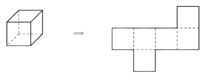 Isaiah cuts open a cardboard cube along some of its edges to form the flat shape shown on the right, which has an area of 18 square centimeters. What was the volume of the cube in cubic centimeters?